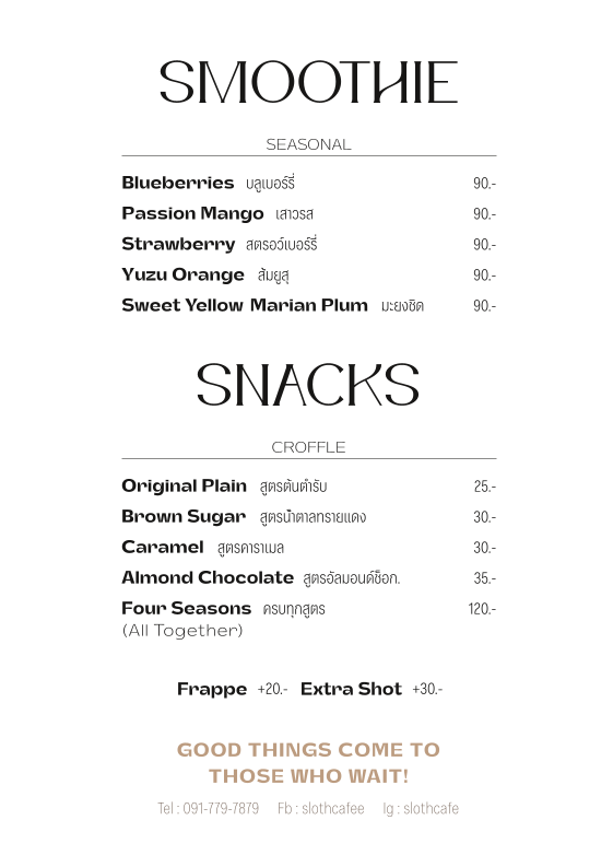 Please feel free to reach out via phone at +66 91 779 7879 for any inquiries or simply drop by to experience the unique charm of SLOTH CAFE!